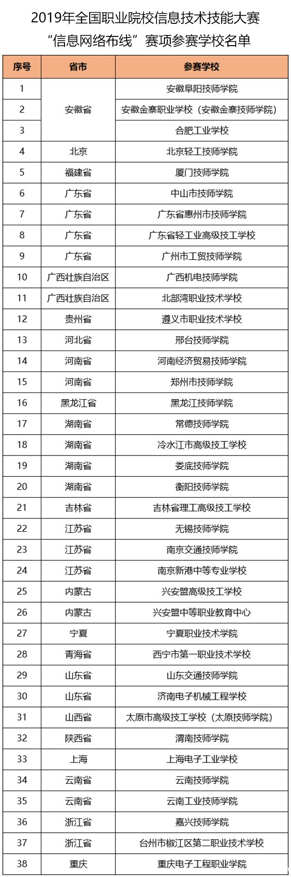 本次大赛是来自吉林省、黑龙江省、江苏省、浙江省、安徽省、福建省、山东省、河南省、湖南省、广东省、贵州省、云南省、陕西省、河北省、青海省、山西省、北京市、上海市、重庆市、内蒙古自治区、广西壮族自治区、宁夏回族自治区等16个省份、3个直辖市、3个自治区38所院校的76个位选手,参加为期2天的比赛。“信息网络布线”中的竞赛模块有:模块A:光缆主干布线系统;模块B:结构化综合布线系统;模块C:家居布线系统;模块D:信息终端安装与调试;模块E:故障链路检测。