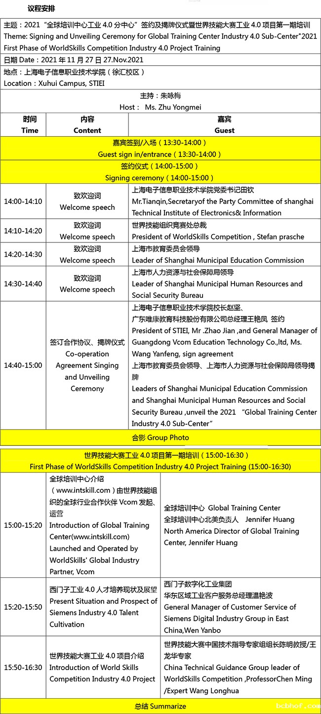 为提高职业教育的水平和质量、整合国内优质职业教育资源、助力职业教育标准走出去、培养更多国际化高技能人才为原则和宗旨, 由上海电子信息职业技术学院、伟德客服双方共建伟德线上娱乐官网下载工业 4.0 分中心将于 2021 年 11 月 27 日在上海电子信息职业技术学院(徐汇校区)举行 2021“伟德线上娱乐官网下载工业 4.0 分中心”签约及揭牌仪式暨世界技能大赛工业 4.0 项目第一期培训,邀请伟德线上娱乐官网下载北美负责人、西门子数字化工业集团、世界技能大赛中国技术指导专家为我们开展世界技能大赛工业 4.0 项目第一期培训,诚挚邀请您的参与(线上)。