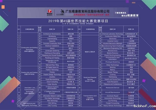 2019年第45届世界技能大赛将设立56个竞赛项目,其中新增5个竞赛项目分别为:云计算、网络安全、化学实验室技术、水处理技术、酒店接待。