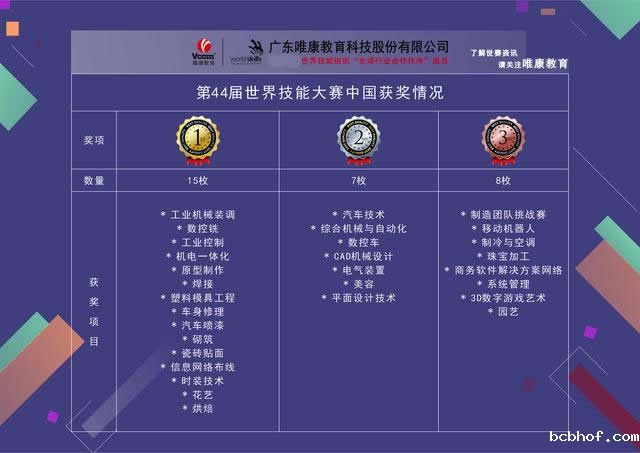 2017年是我国第四次组团参加世界技能大赛,参加47个赛项,获得了15枚金牌、7枚银牌、8枚铜牌和12个优胜奖,取得了参加世界技能大赛以来的成绩。其中工业机械装调项目的选手宋彪,以参赛选手分获得阿尔伯特大奖。