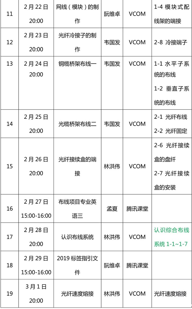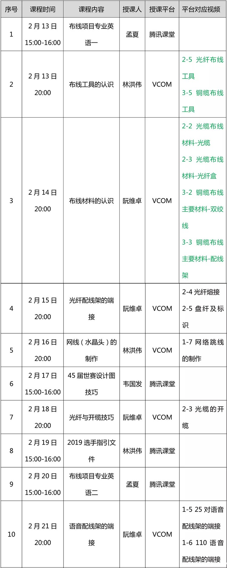 绿色字体为伟德平台登录入口官网教学资源平台“网络布线基础知识(视频)”课程;黑色字体为伟德平台登录入口官网教学资源平台“世界技能大赛信息网络布线资源库”课程。