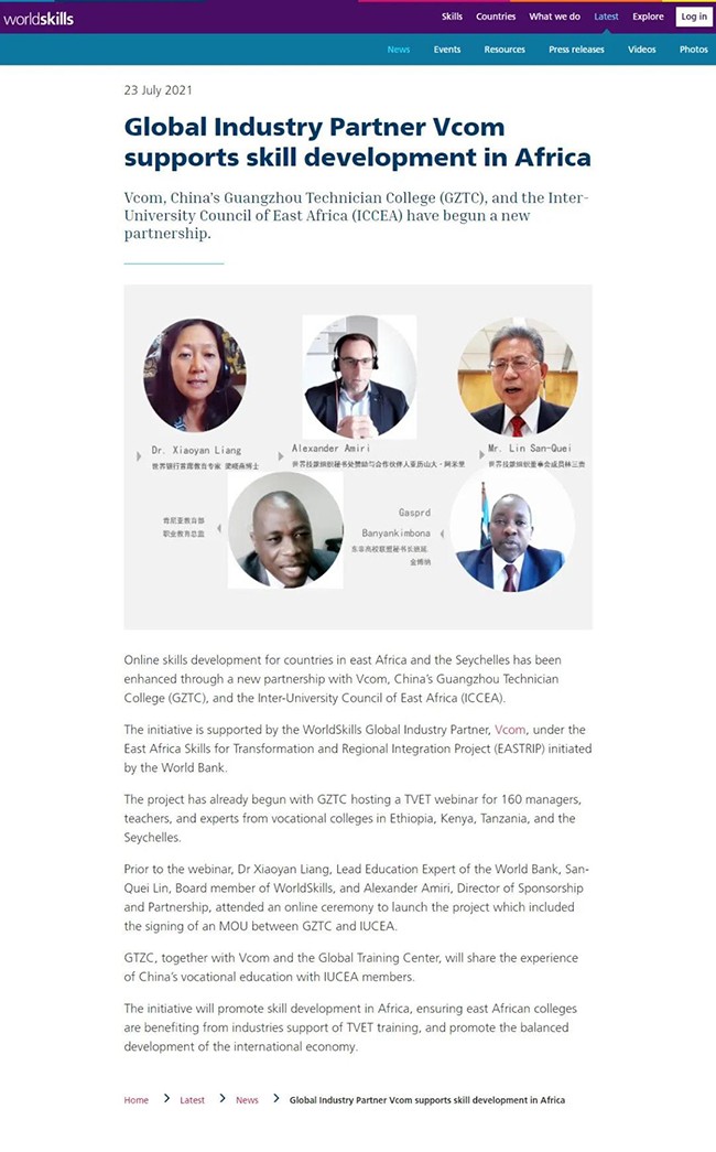 2021年5月25日,广州市技师学院与“伟德线上娱乐官网下载——世界技能组织(WSI)全球行业合作伙伴”的发起人和运营方伟德客服合作,为世界银行(World Bank)的东非职业技术教育改革与区域一体化项目(EASTRIP)的日常管理机构东非高校联盟(IUCEA)及EASTRIP项目的受惠国——埃塞俄比亚、肯尼亚、坦桑尼亚和塞舌尔等国家的职业院校中高层管理者、教师和职业教育专家约 160 人提供线上职业教育专题讲座,分享中国职业教育改革发展历程及广东职业教育在对接产业发展方面的创新经验。