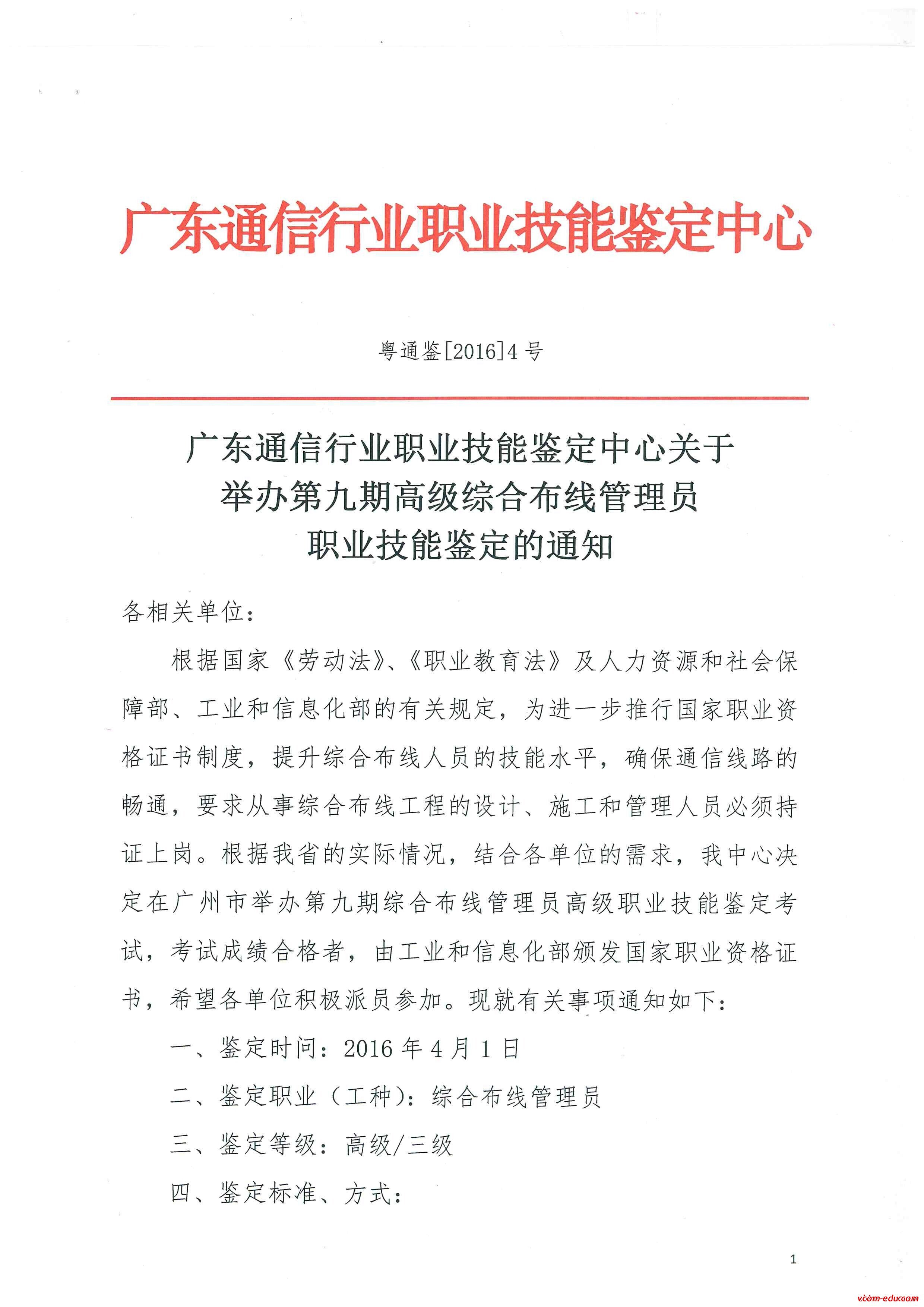 根据国家《职业教育法》、《劳动法》、人力资源与社会保障部及工业和信息化部的有关规定,为提升综合布线人员的技能水平,我们决定对从从事通信线路维护及网络综合布线的管理、施工与维护人员实行职业技能培训和技能鉴定。对培训及考核合格者将由国家人力资源和社会保障部及工业和信息化部颁发“综合布线管理员(高级)”国家职业资格证书、Vcom智能楼宇学院颁发《Vcom综合布线管理员》行业资格培训证书。该证书电子注册,全国通用。能够证明持证人达到相关职位要求的技术水平,及相应岗位要求的理论基础和应用能力,可作为企业专业技术人员岗位聘用、任职、定级和晋升职务的重要依据。获得证书者可免费进入全国信息技术人才库,并为用人单位提供证书在线和认证。国家职业资格证书全国联网网站:http://zscx.nvq.net.cn/