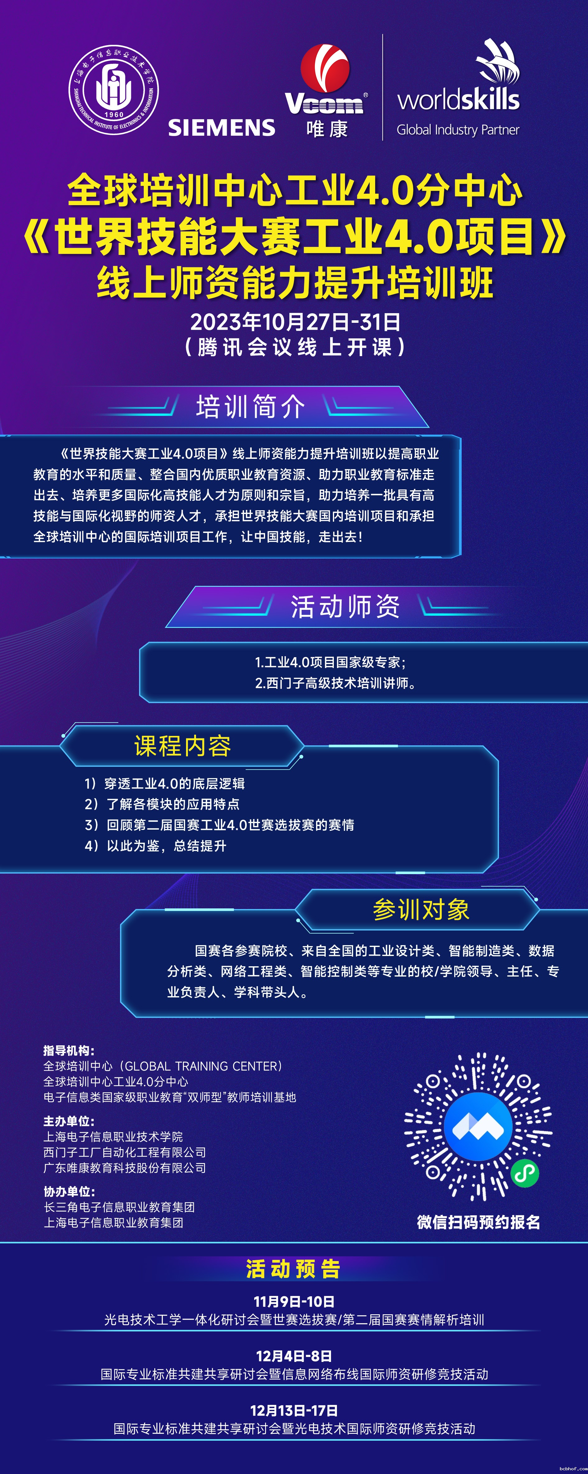 《世界技能大赛工业4.0项目》线上师资能力提升培训班,由伟德线上娱乐官网下载(Global Training Center)、伟德线上娱乐官网下载工业4.0分中心、电子信息类国家级职业教育“双师型”教师培训基地指导,上海电子信息职业技术学院、西门子工厂自动化工程有限公司与伟德客服联合主办,长三角电子信息职业教育集团、上海电子信息职业教育集团协办,为期5天,诚挚邀请您拔冗参与。